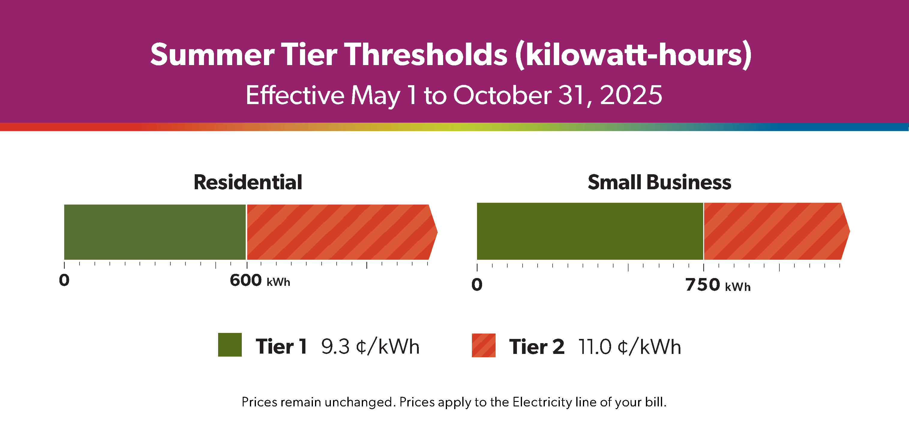 | Tier Thresholds | Winter(November 1 – April 30) | Summer(May 1 – October 31) | Tiered Prices (¢/kWh) |