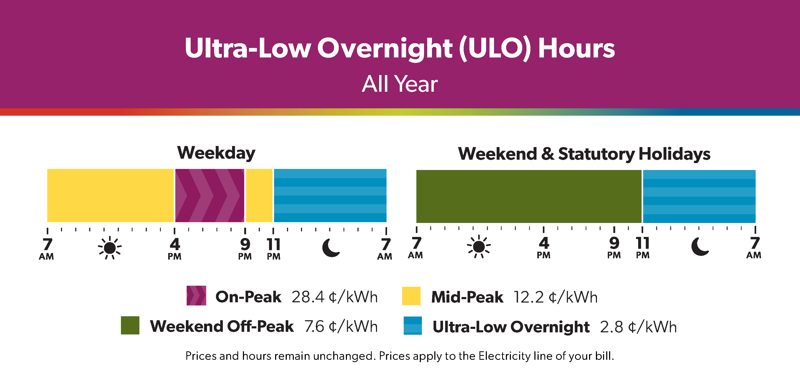 With Time-of-Use (TOU) and Ultra-Low Overnight (ULO), the price depends on when you use electricity. This means you can help manage your electricity costs by shifting your usage to lower price periods when possible.
